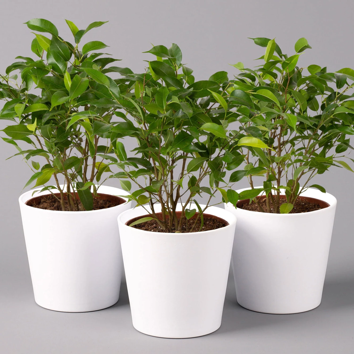 Der Ficus benjamina ‚Natasja’‘ mit seinen dunkelgrünen, glänzenden Blättern ist ein Highlight für jeden Raum. Bekannt ist diese Zimmerpflanze auch unter dem Namen Birkenfeige und besticht mit ihrem buschigen Wuchs und den spitz zulaufenden Blättern. Ihre Birkenfeige macht sowohl im Wohnzimmer als auch im Office eine gute Figur und fühlt sich in hellen sowie halbschattigen Lagen gleichermaßen wohl. Auch für Ihr Schlafzimmer ist der Ficus benjamina ‚Natasja‘ die richtige Wahl, da er Schadstoffe, wie z.B. Kohlenmonoxid abbauen kann. Gießen Sie den Ficus eher sparsam, das Substrat können Sie gerne antrocknen lassen. Im Sommer dürfen Sie Ihre Birkenfeige auch im Freien an einem windgeschützten Standort ohne direkte Sonneneinstrahlung stellen. Achten Sie darauf, dass es der Pflanze nicht zu kalt wird, denn auch im Winter dürfen die Lufttemperaturen im Raum nicht unter 15 Grad Celsius fallen. Bitte stellen Sie Ihre Birkenfeige außerhalb der Reichweite von Kindern oder Hautieren auf, da ihr Milchsaft giftig ist.