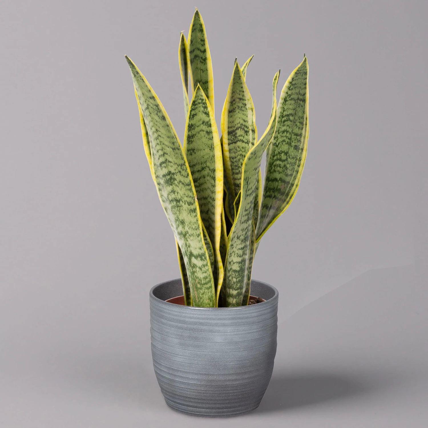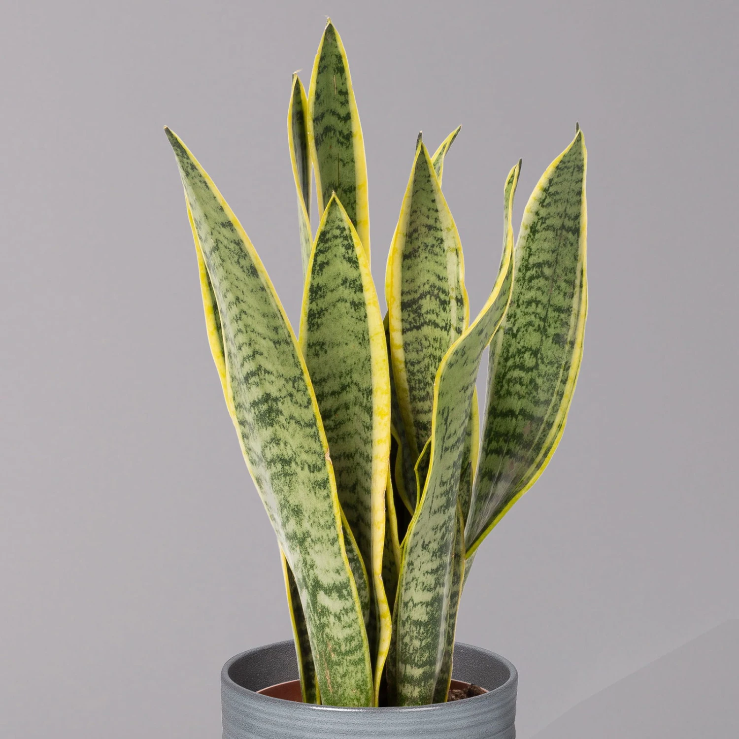 Der Bogenhanf (Sansevieria trifasciata ‚Laurentii‘) gilt als eine der robustesten und pflegeleichtesten Zimmerpflanzen überhaupt und ist auch unter den Namen ‚Sansevierie‘ oder ‚Schwiegermutterzunge‘ bekannt. Charakteristisch sind die riemenartig festen, fleischigen Blätter, deren Blattränder beidseitig gelbe Querstreifen aufweisen. Die grundständigen Blätter entspringen einem Rhizom und enden aufrecht in einer Spitze. Bei guter Pflege kann der Bogenhanf über einen Meter hoch werden.